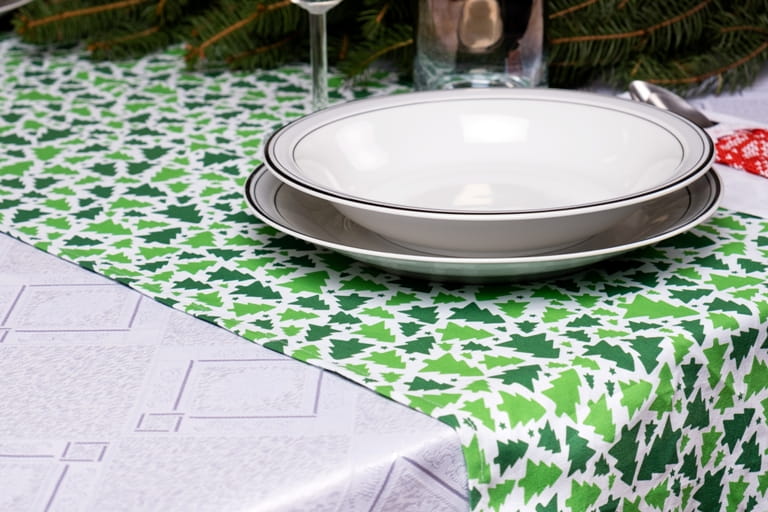 Bieżnik świąteczny zielony z prześlicznej bawełny w choinki , wykończony oryginalną włoską żakardową koronką.