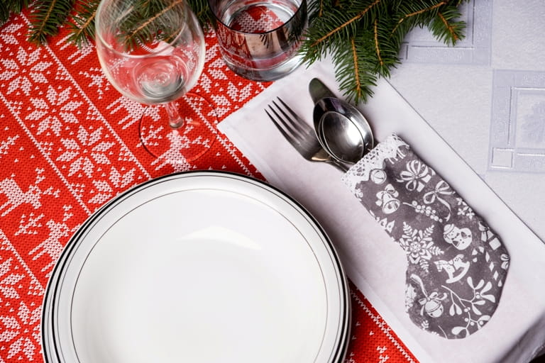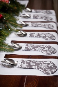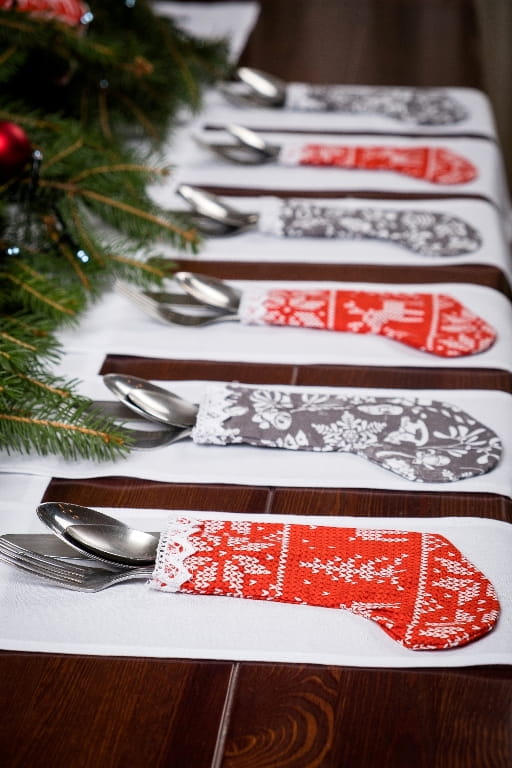Skarpety na sztućce wykonane z bawełny z motywem świątecznym wykończone prześliczną włoską żakardową koronką, ozdobią wigilijny stół.