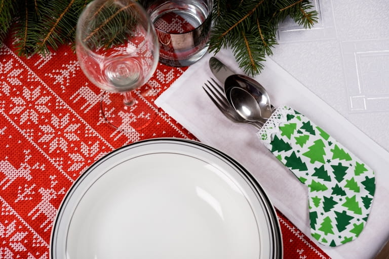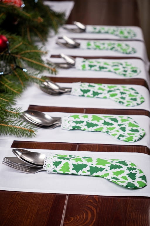 Skarpety na sztućce wykonane z bawełny z motywem świątecznym wykończone prześliczną włoską żakardową koronką, ozdobią wigilijny stół.