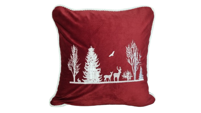 Poduszka świąteczna czerwona z haftem zimowy krajobraz