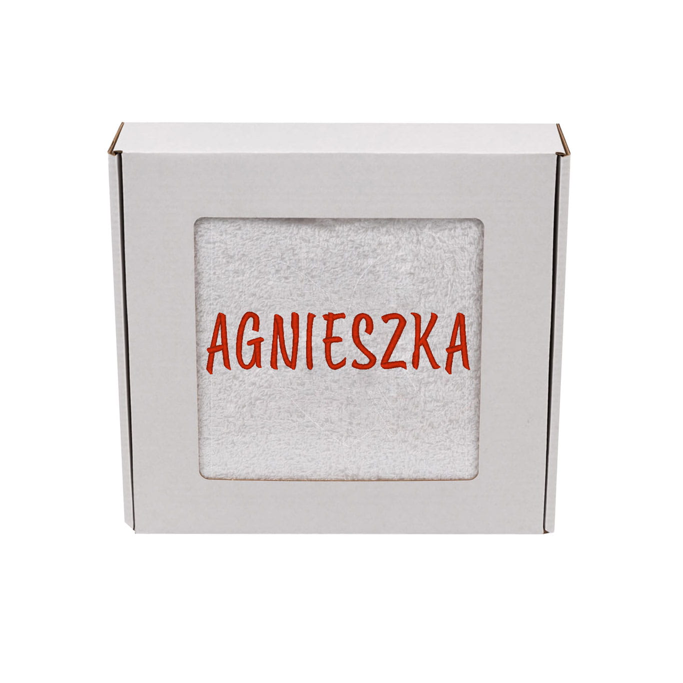 Pudełko z okienkiem – eleganckie, tekturowe opakowanie, które pięknie eksponuje haftowany napis. Gotowe do wręczenia!