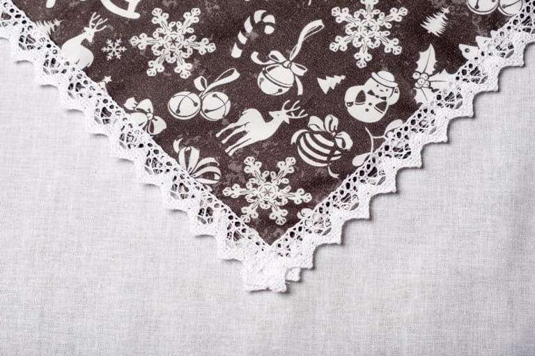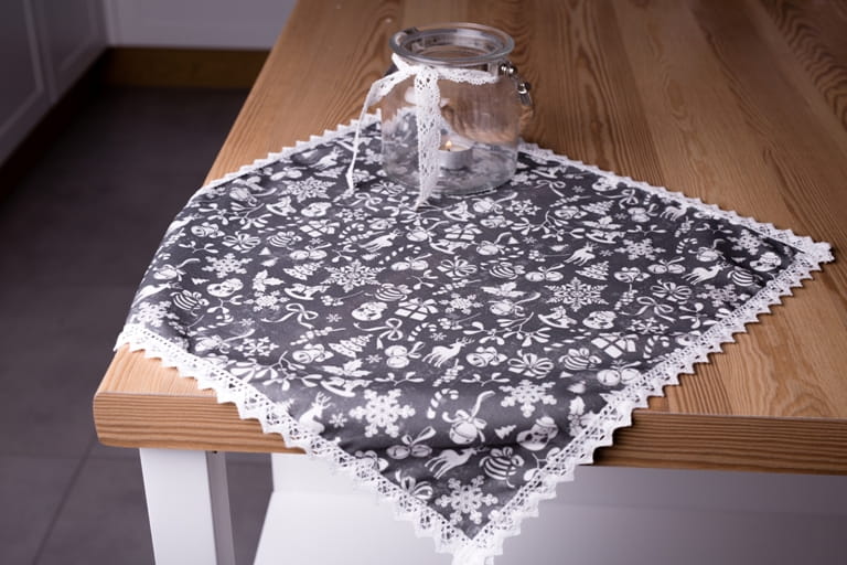 Serweta świąteczna szara z prześlicznej bawełny z motywem świątecznym , wykończona oryginalną włoską żakardową koronką.