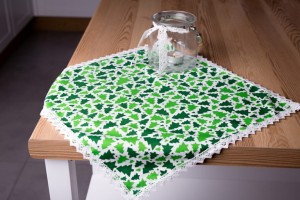 Serweta świąteczna zielona z prześlicznej bawełny w choinki , wykończona oryginalną włoską żakardową koronką.