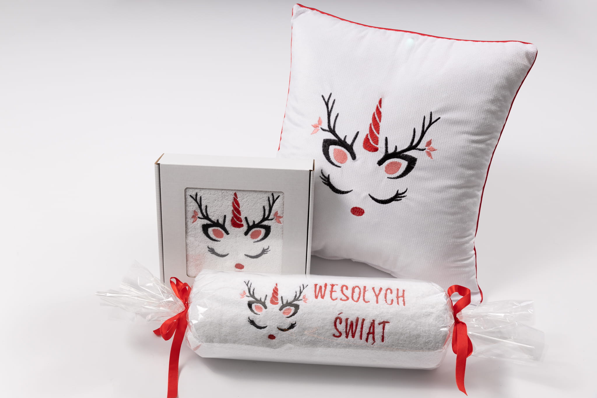 Prześliczny komplet - 2 ręczniki i poduszka z oryginalnym, świątecznym motywem. Miękkie w dotyku i puszyste, w połączeniu z prześlicznym haftem stworzą niepowtarzalny klimat w Twoim domu.