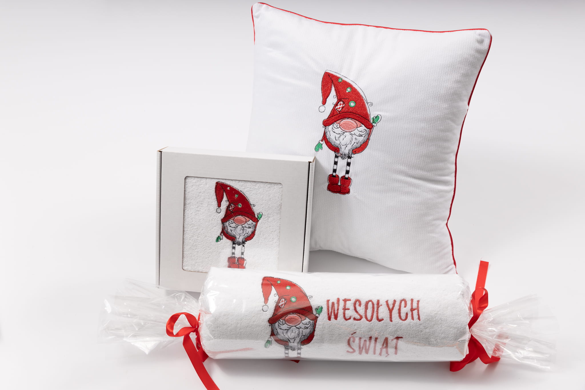 Prześliczny komplet - 2 ręczniki i poduszka z oryginalnym, świątecznym motywem. Miękkie w dotyku i puszyste, w połączeniu z prześlicznym haftem stworzą niepowtarzalny klimat w Twoim domu.